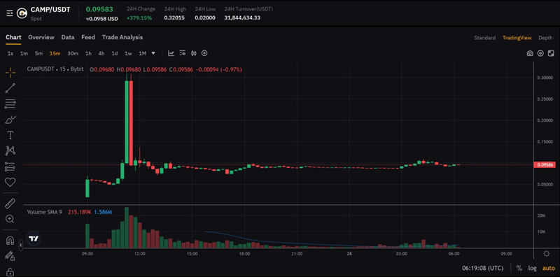 CAMP开盘最高涨幅超1500%据市场数据,CAMP代币开盘价为0.02 USDT,最高一度涨至0.32 USDT,相较开盘价涨幅超过1500%。按最高价计算,FDV一度突破32亿美元。目前价格约0.096 USDT。