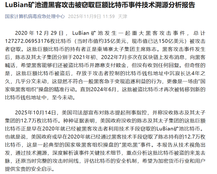 2020 年 12 月 29 日,LuBian 矿池遭遇精准网络攻击,短短两小时内,12.7 万枚比特币被攻击者转移至特定钱包地址。与常规网络攻击后资产快速拆分变现的操作不同,这批巨额数字资产在攻击者控制的地址中沉寂长达四年,几乎未发生任何交易流转。这种反常的持有策略,与普通网络攻击的获利逻辑背道而驰,引起了安全研究机构的高度关注。